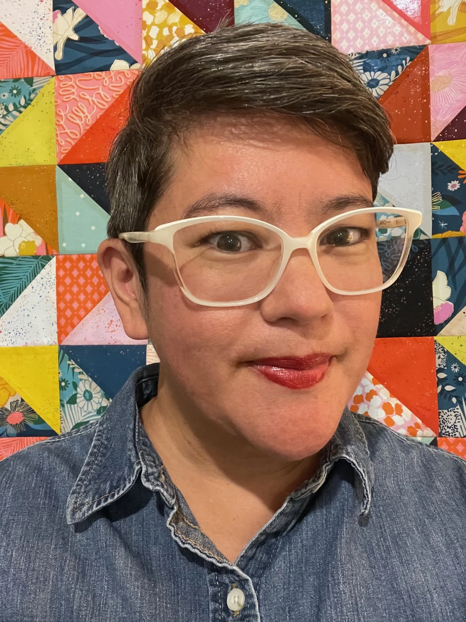 Image description: A photo of a femme person with short dark hair and glasses, standing in front of a colorful quilt, smiling at the camera.